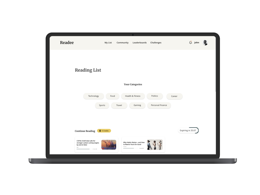 On the main page, the articles will be organised into categories, and users will receive reminders for unfinished pieces. To nudge users to finish the articles they start, articles will also have expiration time frames to add a sense of urgency.