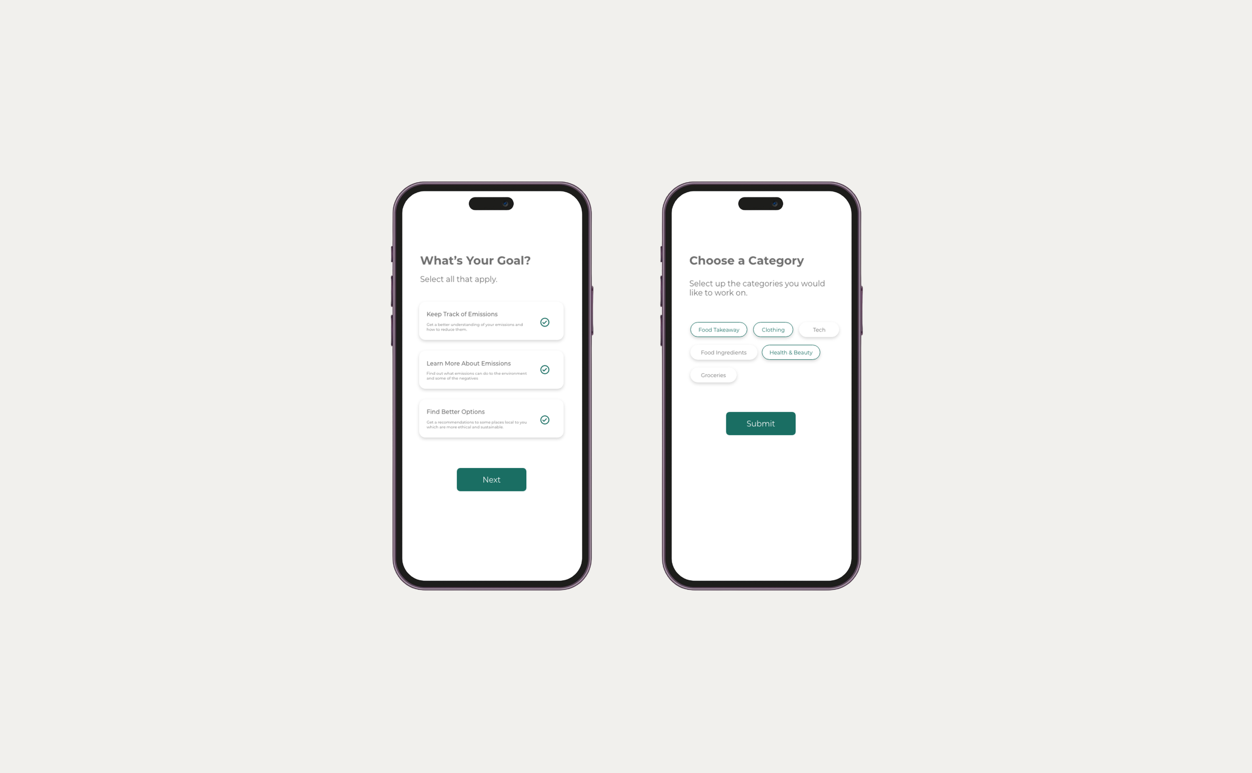 The concept enables users to gain a holistic view of their carbon emissions through data visualisation and take steps towards making sustainable choices. The goal of this concept was to allow users to set weekly goals, and once they are completed, make them eligible for rewards. The rewards consist of discounts for local sustainable and ethical businesses within walking distance.