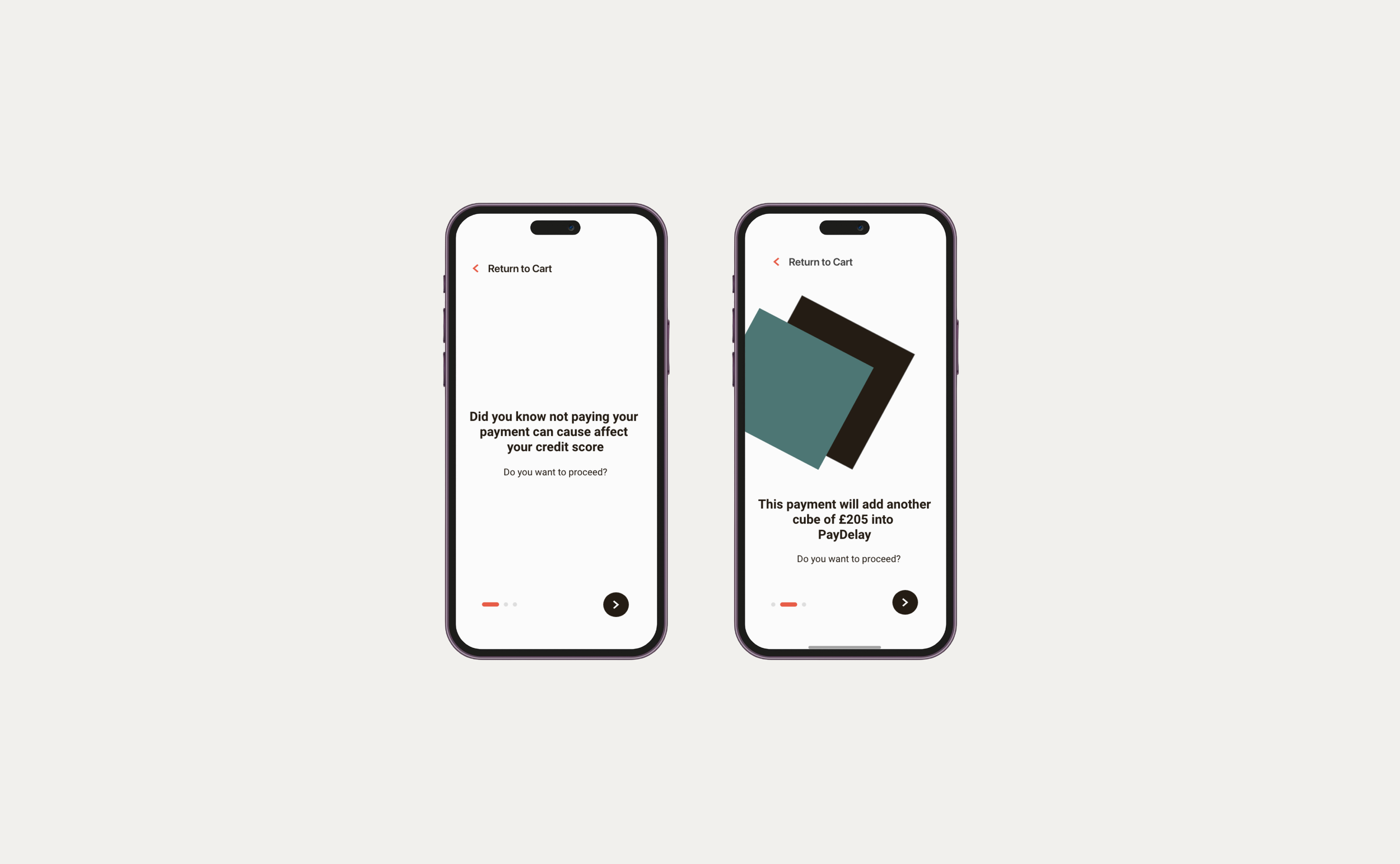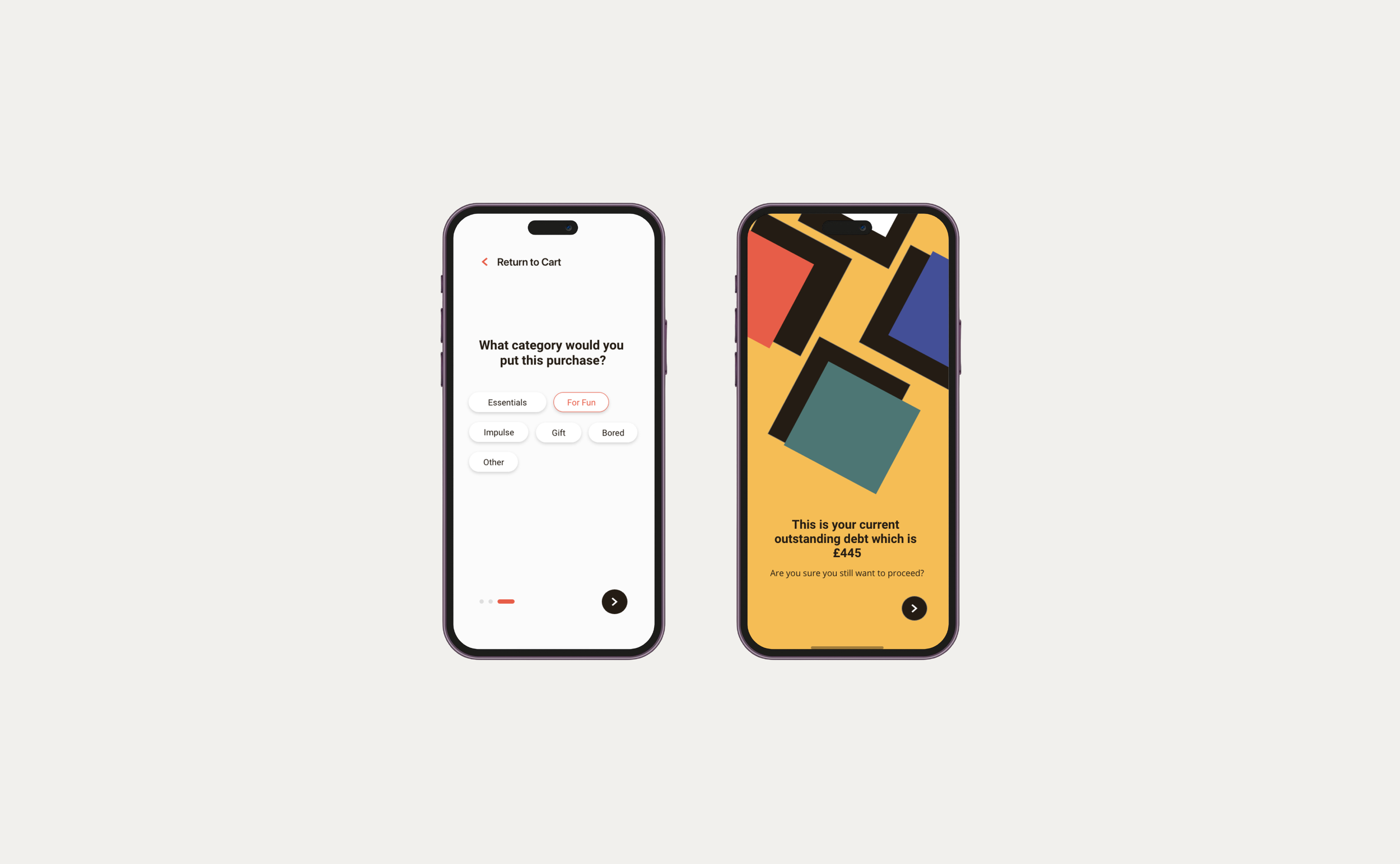 The use of different bold colours further enhances the visualisation and creates a stark difference in the interface, redirecting users' focus on reevaluating the purchase and the idea of avoiding impulse buying without thinking through whether the purchase is important.