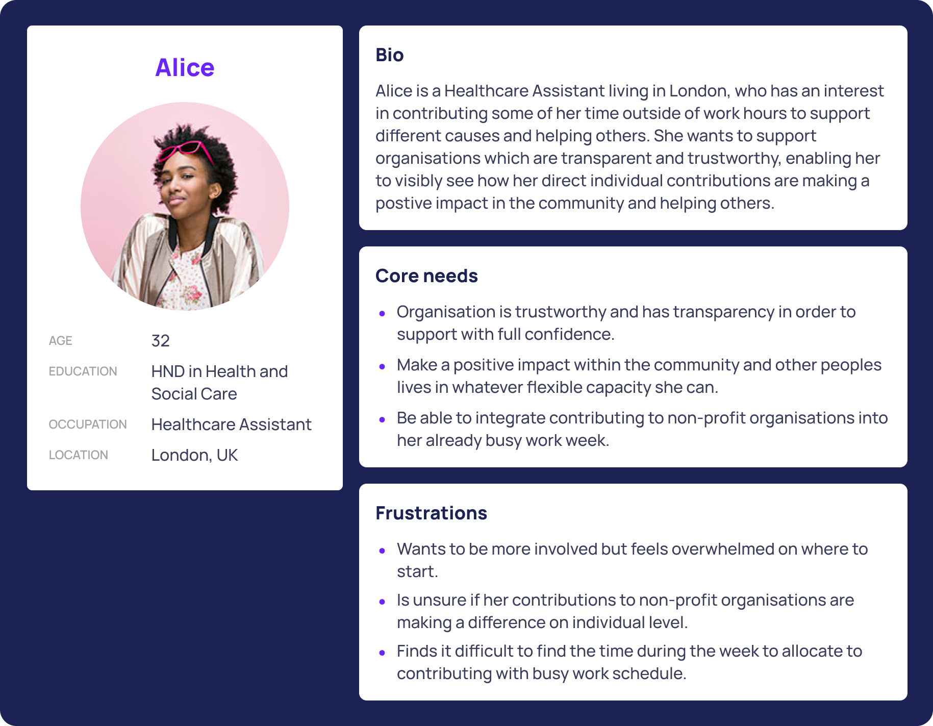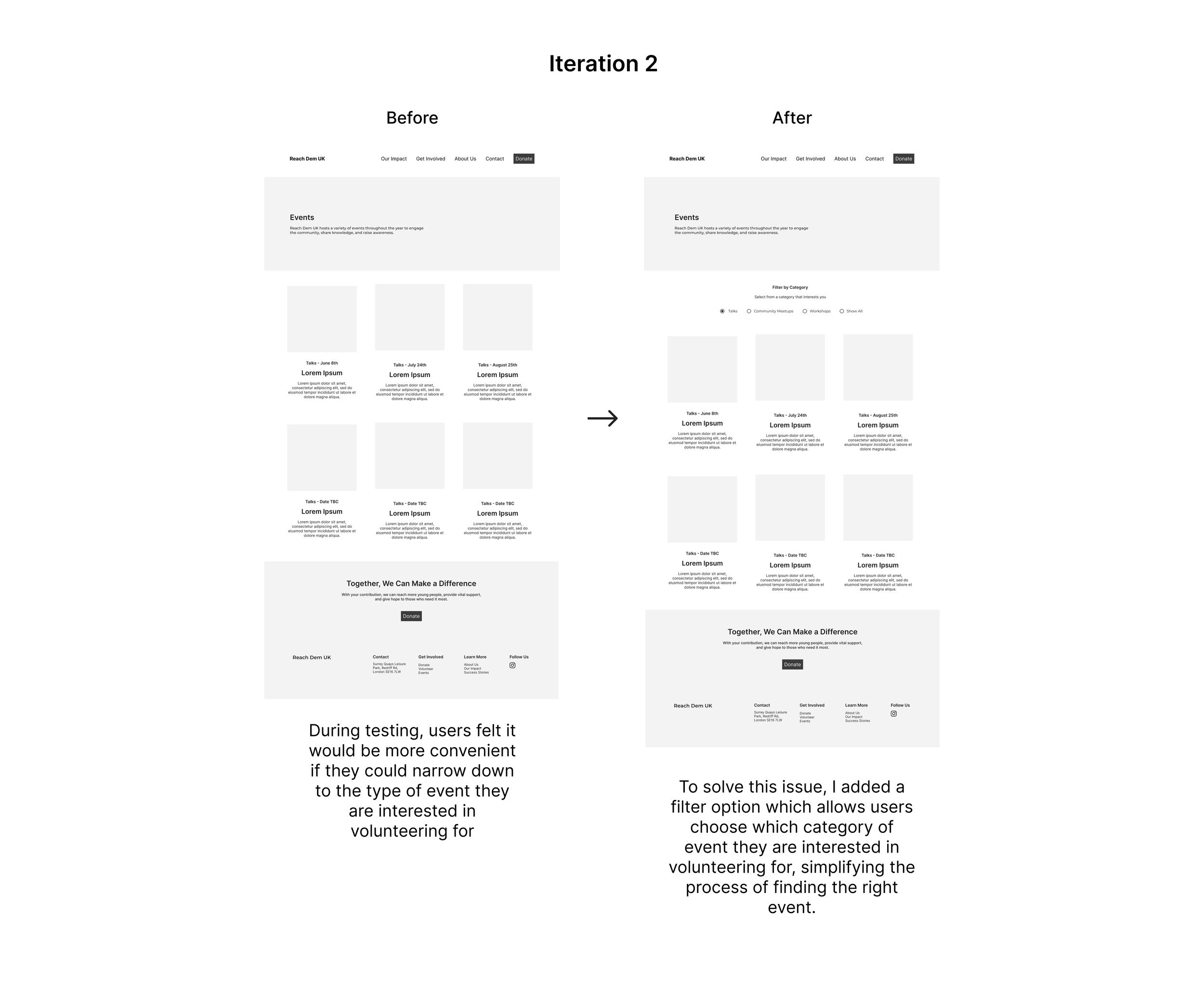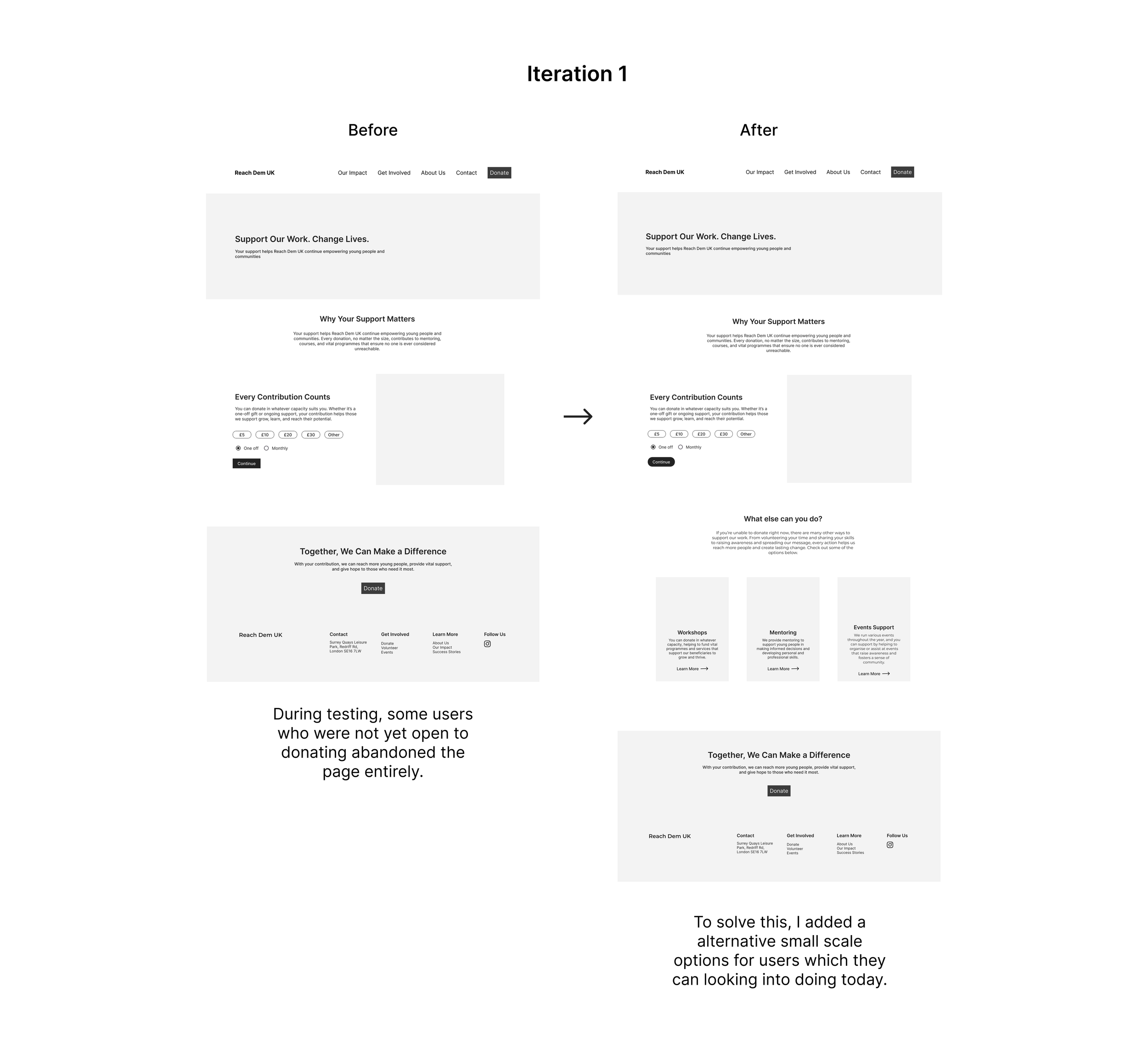 Simplifying the process of volunteering by integrating a “Get Involved” page, turning it into a one-entry point. Offering flexible ways to contribute, which include low-effort options that still have a strong positive impact on the organisation and the beneficiaries’ lives. Ultimately, reducing the friction in the process of getting involved.