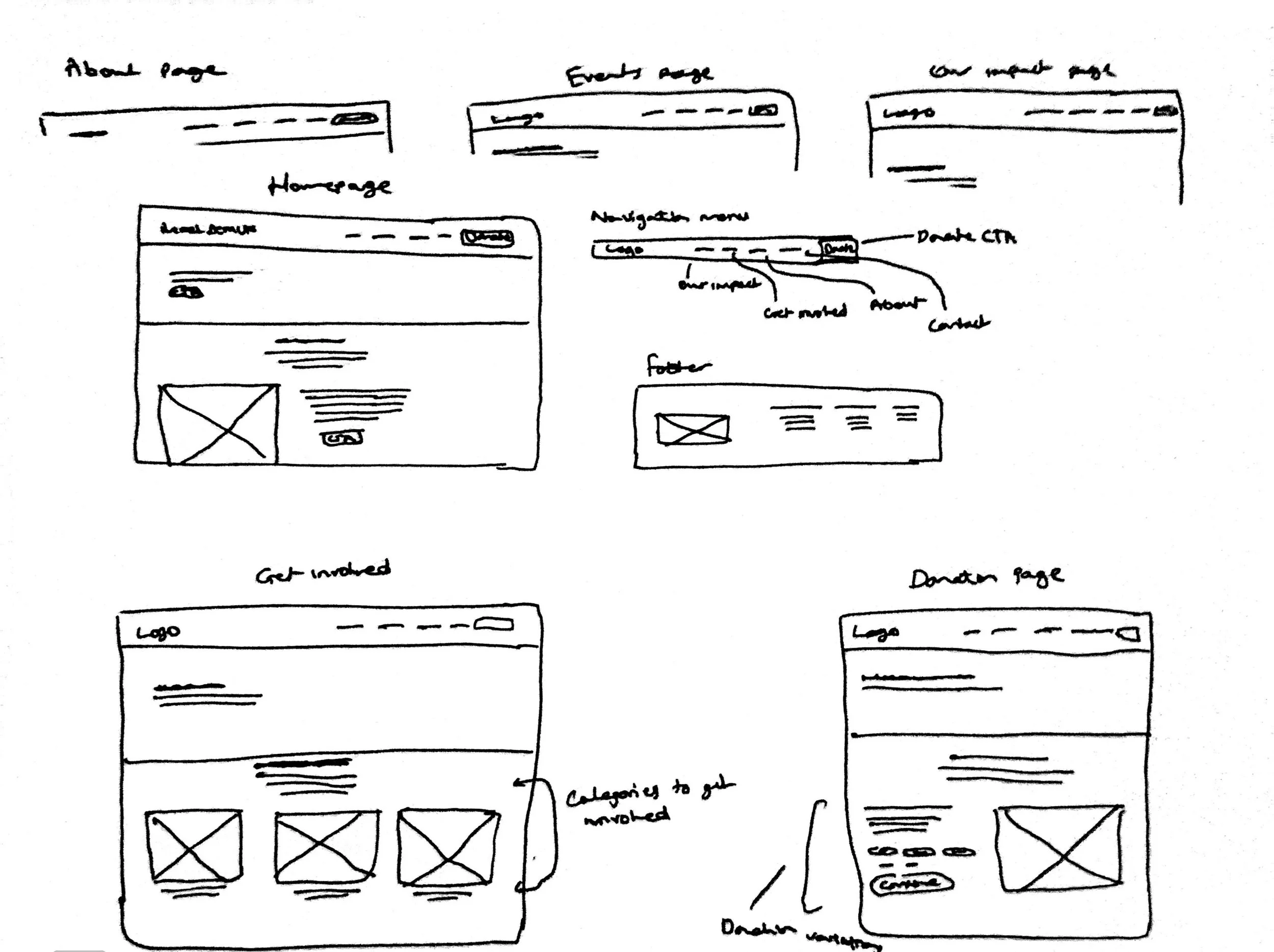 Using insights from research, I began sketching early layout ideas for Reach Dem UK’s website. Given the project’s time constraints, sketching allowed me to rapidly explore different structures while balancing user needs with the organisation’s goals before moving into wireframes.