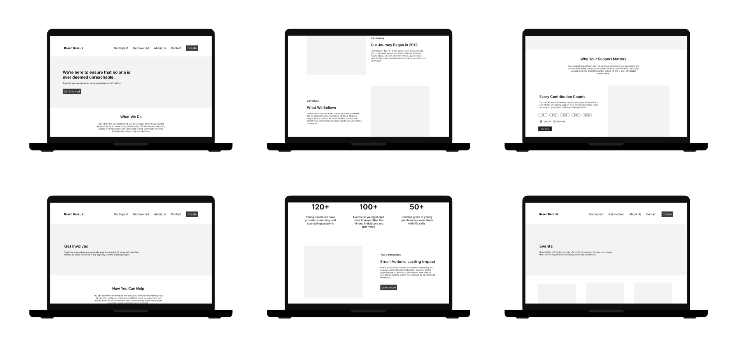The next step was to start creating wireframes on Figma in order to conduct usability testing sessions later and gather any feedback. During this stage, stakeholders also reviewed the early wireframes in our meeting and suggested emphasising the mission statement and journey. I incorporated this feedback into the wireframes before moving into usability testing.