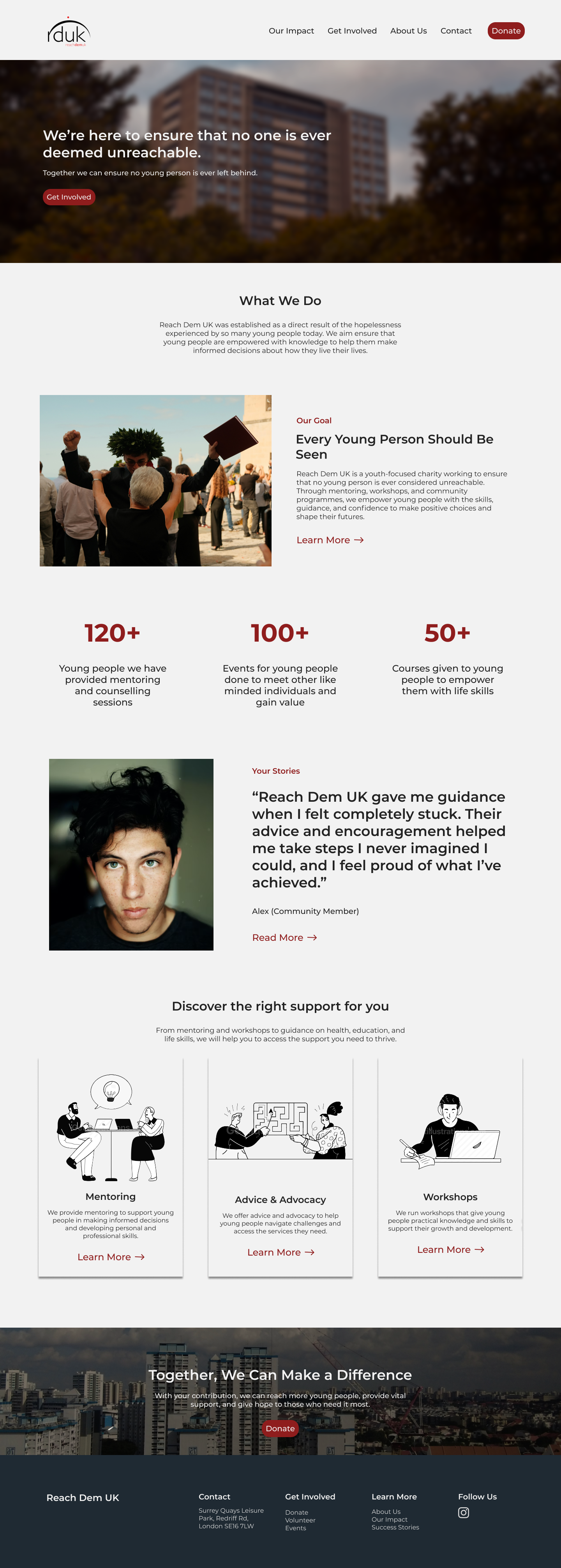 In the home and about page, elaborated more on Reach Dem UK’s mission, values and journey to build confidence and trust with community members. Added a testimonials section to further ensure community members can contribute with confidence.