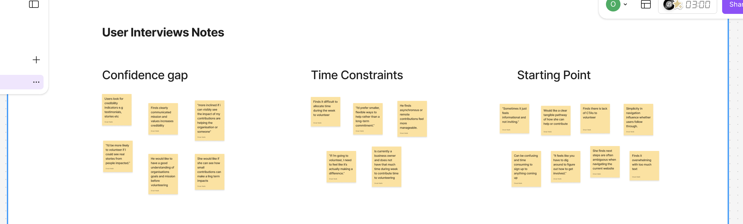 Building on the insights derived from competitive analysis, I conducted interviews with 10 Reach Dem UK’s community members to understand their experiences being involved with the organisation and identify the challenges they are currently facing. The goal was to also gain an understanding of their motivations and desires behind which specific causes they support. The next step was to synthesise findings through an affinity mapping exercise to find common themes and patterns.